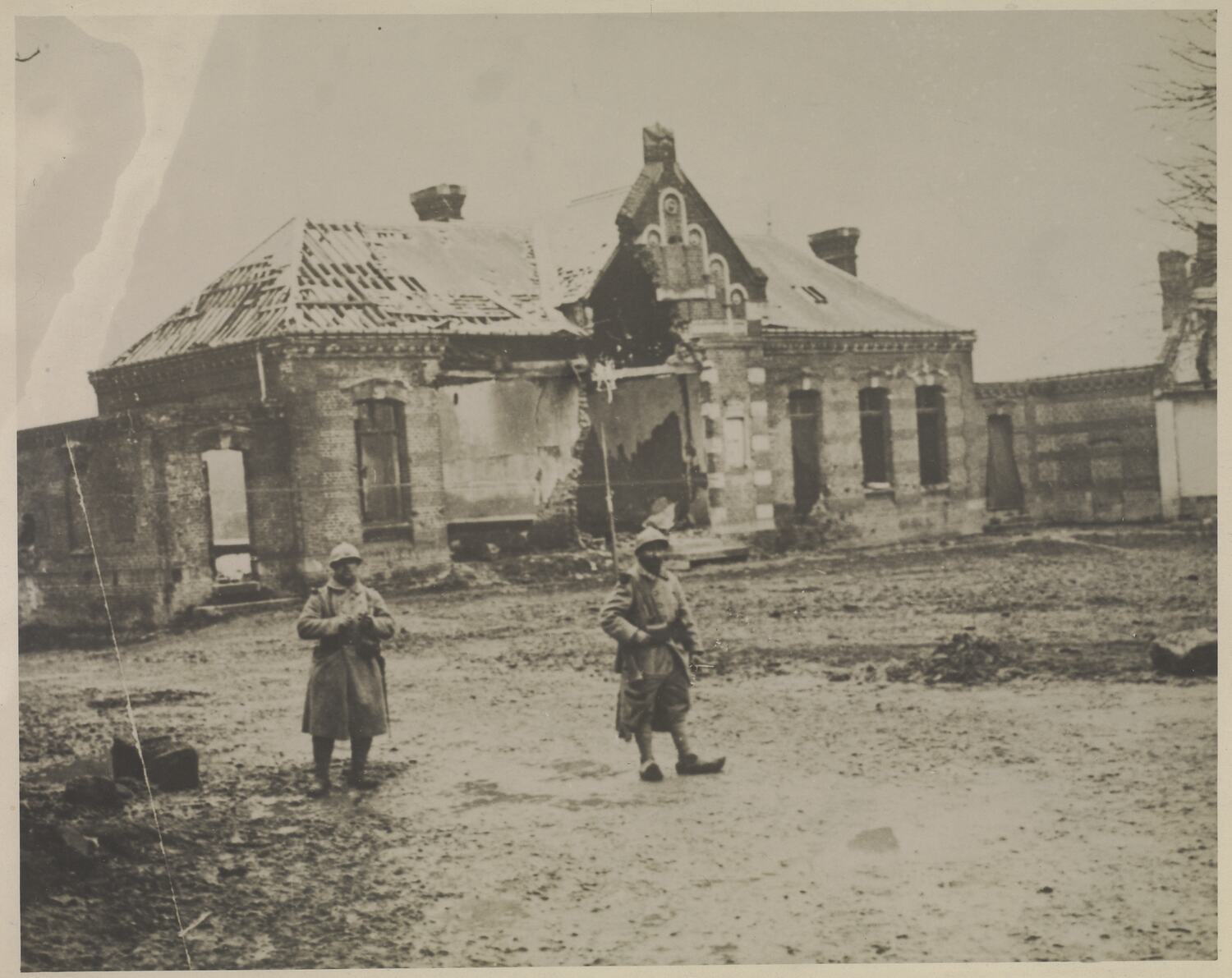 Streetscape showing a destroyed building in Somme. Two men in military uniform are standing on a road in the foreground.