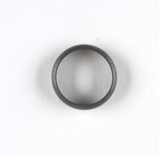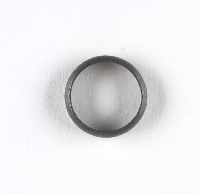 Dull grey metal ring, plain band. Inscribed on the inside of the ring.