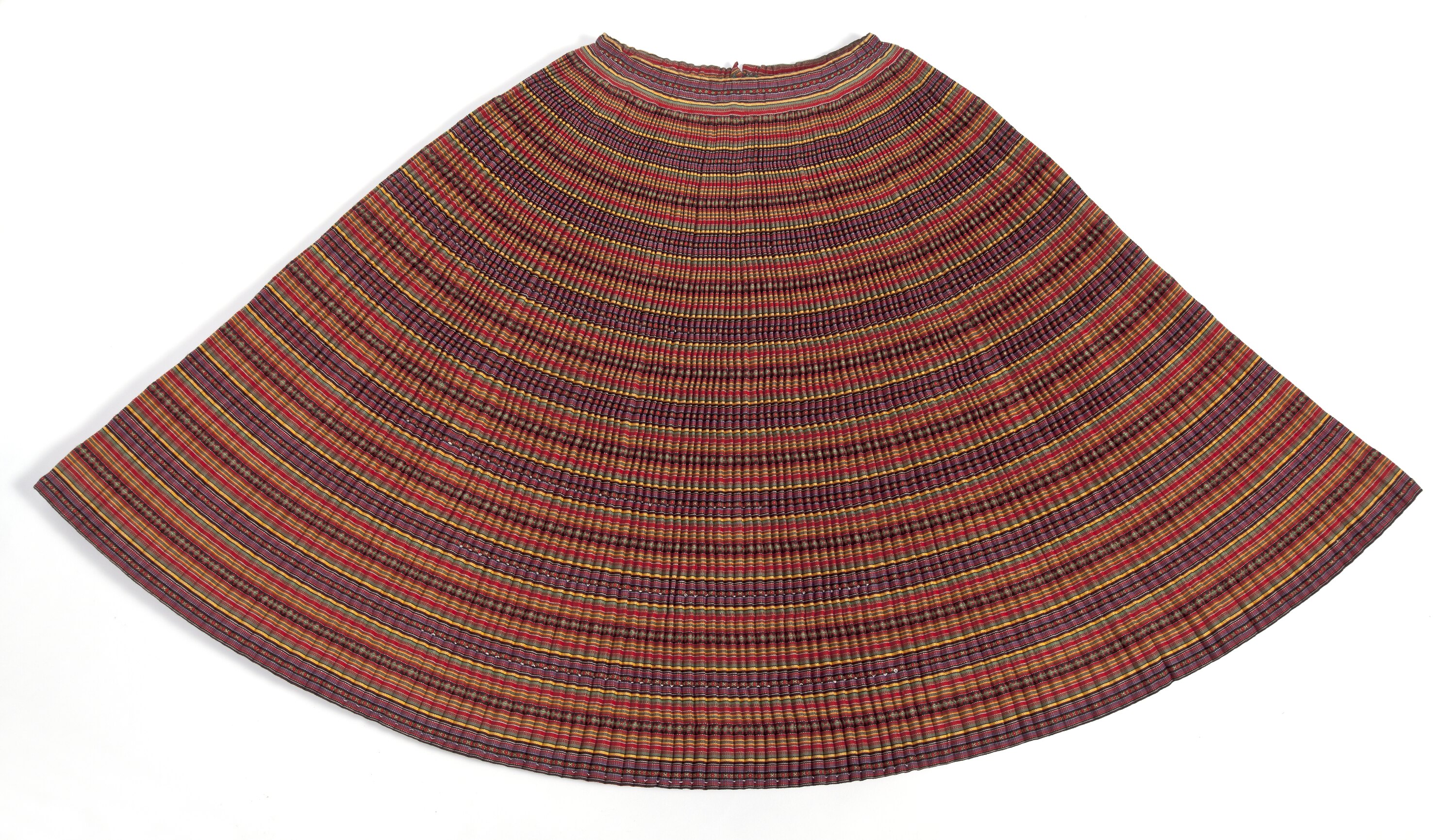 Colourful woven pleated skirt brought to Melbourne by Selo Vitanovac, son of Vojislav Stojkovic, when he came to visit his father and his new wife and children in 1964. Selo brought the skirt along with some other items as a gift for his father and his family, it was at least 100 years old when Selo brought it out in 1964. It had been worn on special occasions in the former Yugoslavian Republic by Mr Stojkovic's relatives, and was again worn on special occasions in Australia by Mr Stojkovic's Australian daughter, Lily.