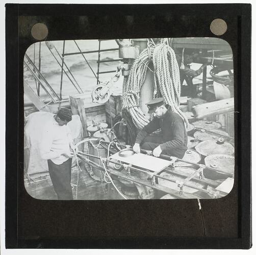 Lantern slide of two RAAF Party members binding a snow sledge, Ellsworth Relief Expedition, Antarctica.