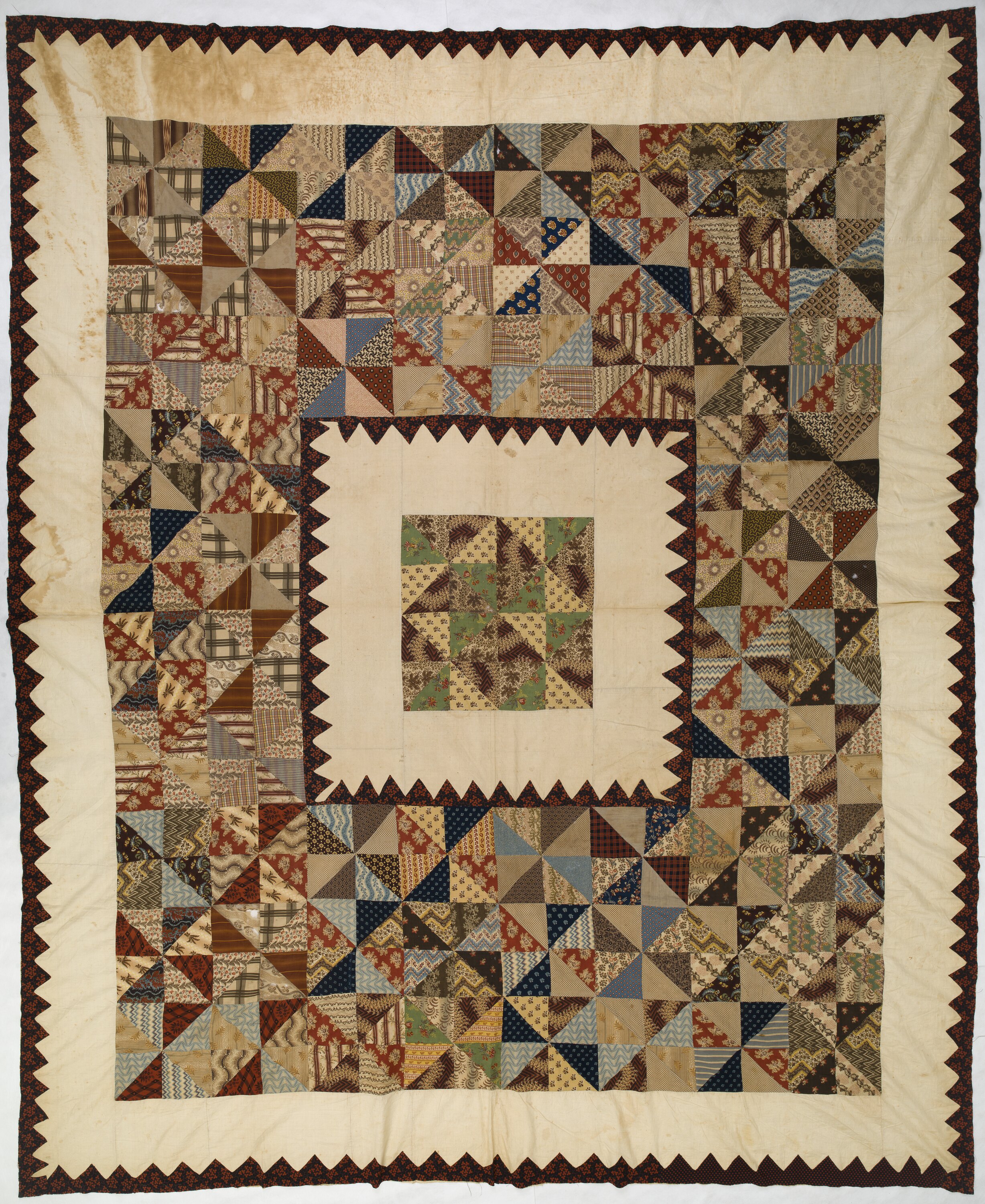 Large cotton quilt consisting of numerous patterned cloth triangles sewn together to create a patchwork of four-inch squares, or units. The units can either be viewed as plain four segment triangle configurations or as pinwheels. The fabrics are in a range of colours and patterns including florals, stripes and zig zags in predominantly browns, reds, creams, blues and green. The quilt has a cream cloth border with saw-tooth edging. This border and edging is repeated at the centre of the quilt framing a patchwork centre medallion. The quilt is not backed, so raw seams are visible. It is also simply tacked around the back edge, suggesting it is unfinished.