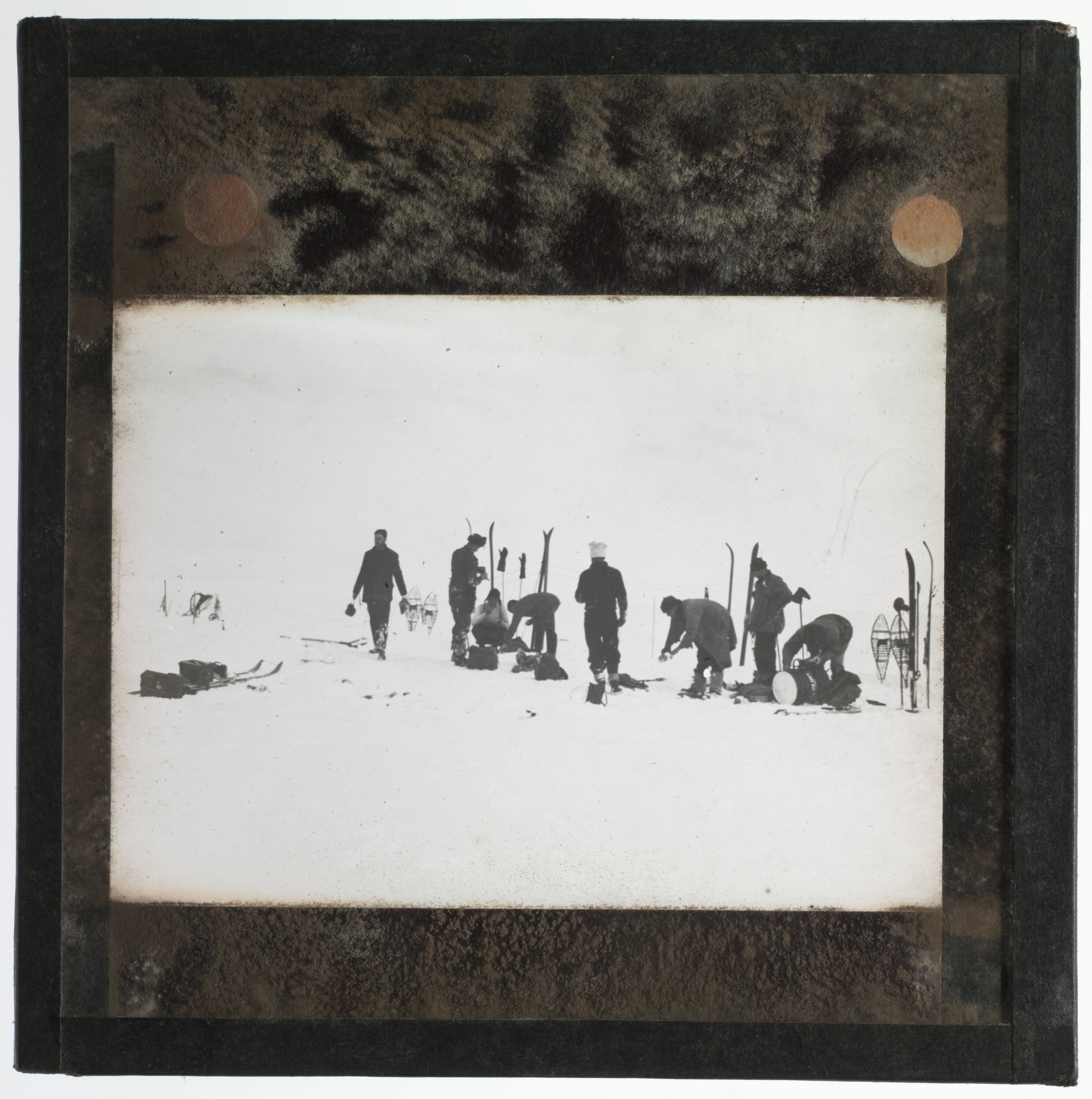 Lantern slide of the combined Discovery II and RAAF personnel search party during the Ellsworth Relief Expedition, Antarctica.