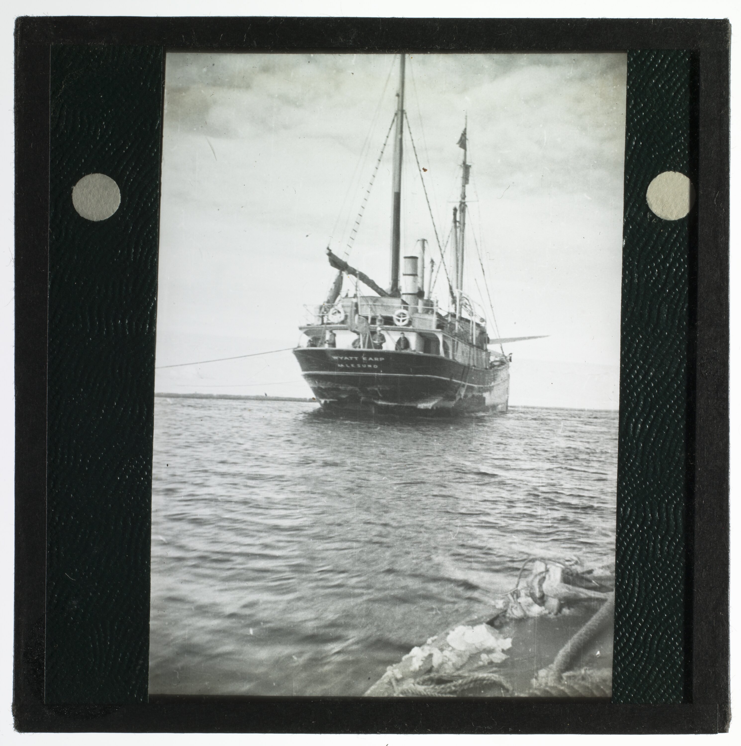 The Wyatt Earp, Lincoln Ellsworth's Expedition Ship in the Bay of Whales, Ross Sea. Photograph taken during the Ellsworth Relief Expedition, 1935-1936.