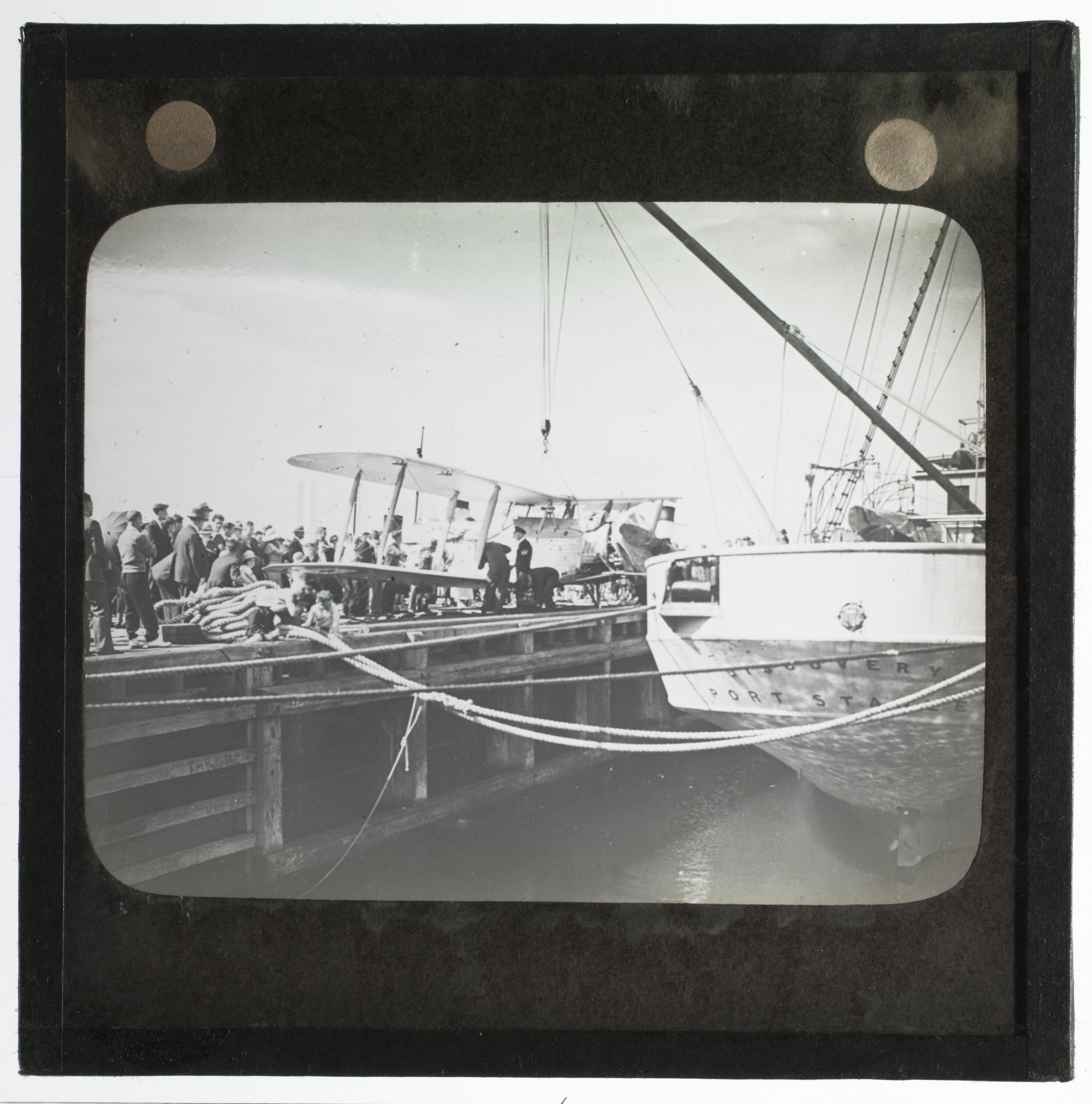 Lantern slide of the RAAF Wapiti A5-37 being loaded onto the ship Discovery 2, Williamstown, Victoria.