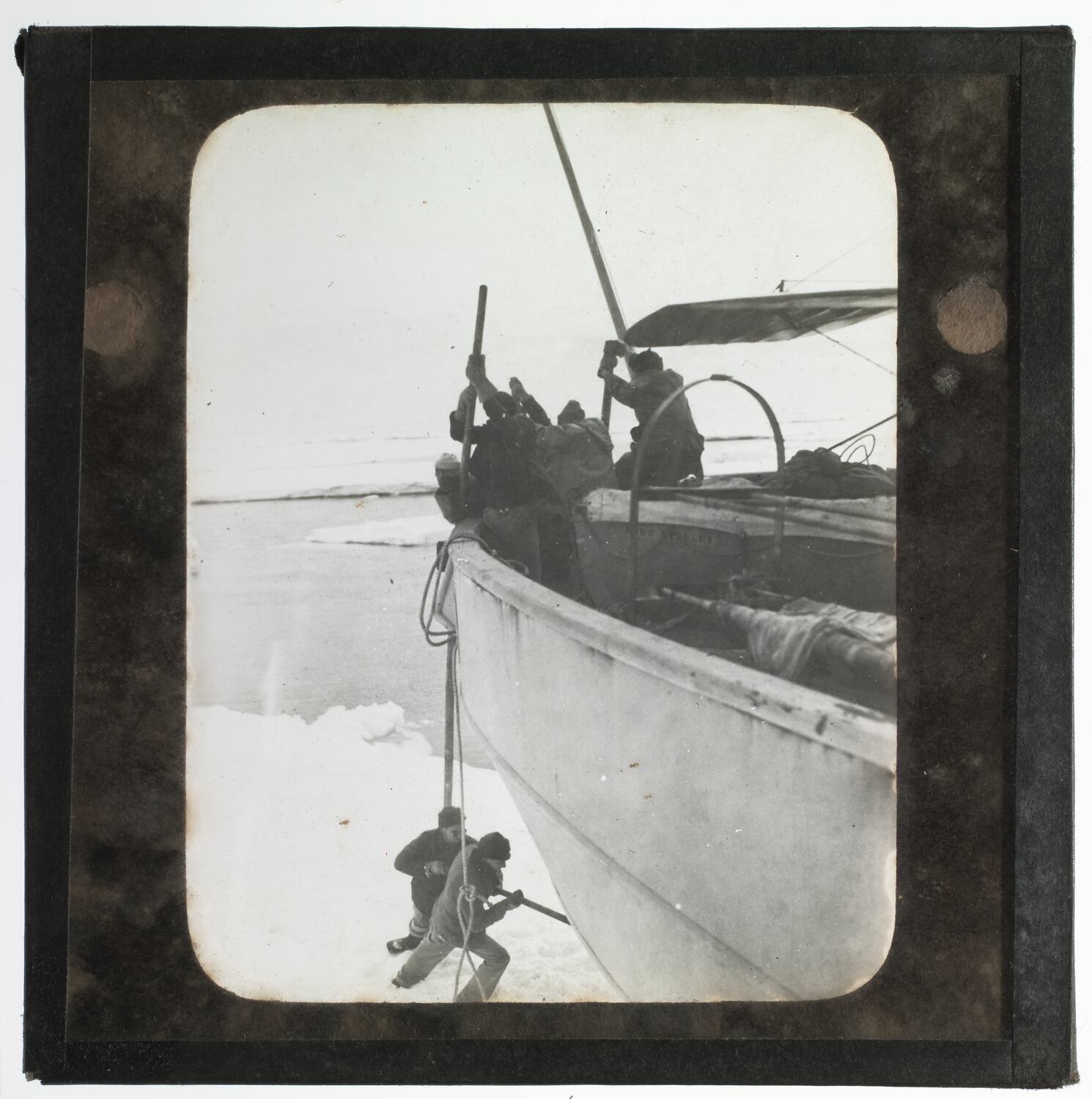 Two of the crew from the Discovery II are 'poling off' standing on ice near the bow of the ship. Other crew members are assisting from the ship's deck above. Ellsworth Relief Expedition 1935-1936. Photograph taken during the Ellsworth Relief Expedition, 1935-1936.
