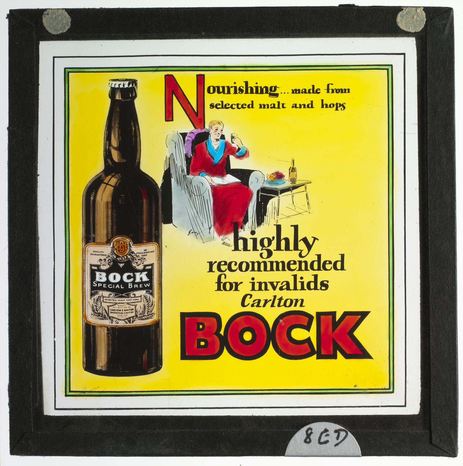 Advertisement for Carlton and United Breweries (CUB). Pictured is a sick man in a robe seated on a couch with a glass of bock in his hand. There is a yellow background on the slide and a bottle of 'Carlton Bock' to the left. Highly recommended for Invalids! Date circa 1931.
