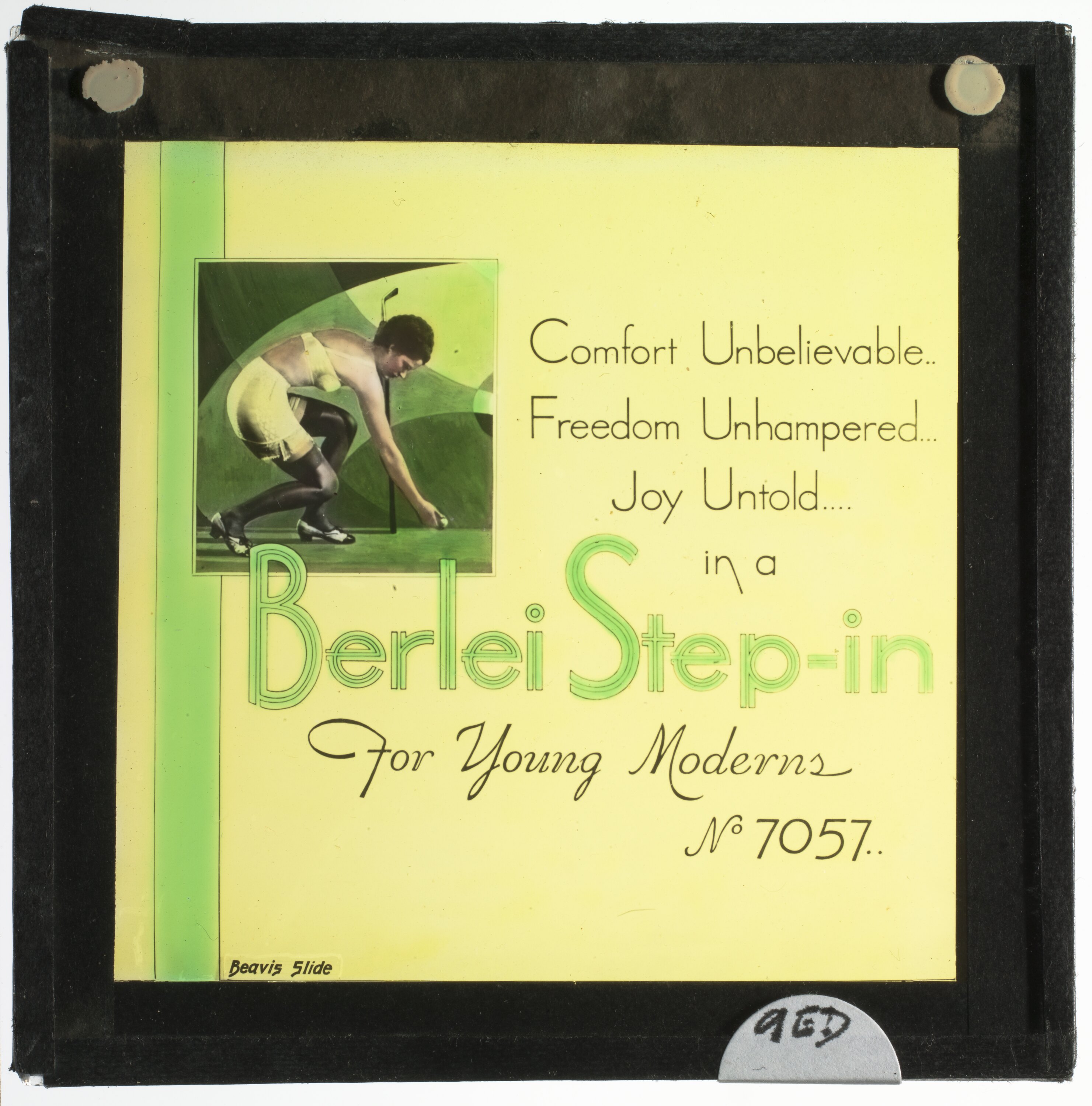 Advertisement for Berlei, step in corsets. The slide is painted yellow with a picture of a woman wearing black stockings and yellow undergarments. She is bending down to place a golf ball on the ground. Comfort unbelievable, Freedom unhampered, Joy untold in a Berlei Step-in! Date circa 1931.