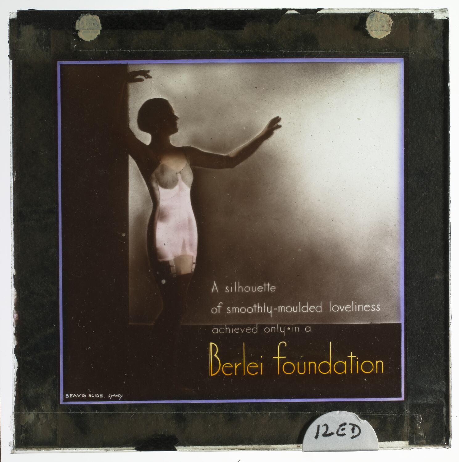 Advertisement for a Berlei foundation garment. Pictured on the slide is a silhouette of a woman wearing a pink corset. A Berlei foundation. Date circa 1931.