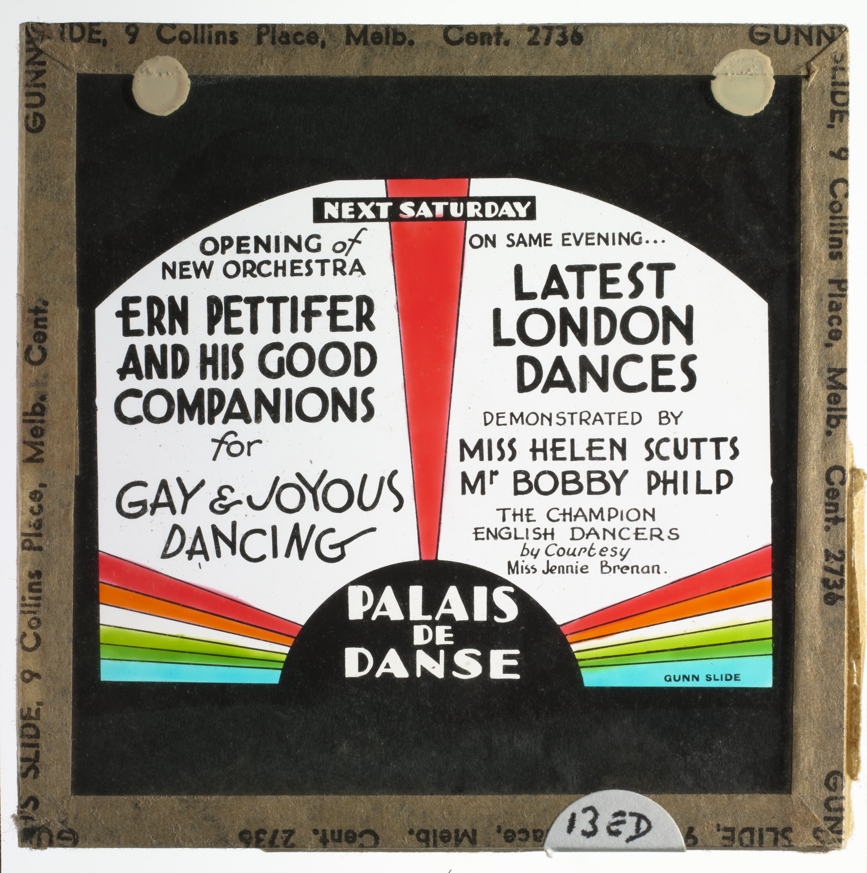 Coloured lantern slide of an advertisment for Ern Pettifer and his Good Companions at the Palais de Danse, circa 1929-1941.