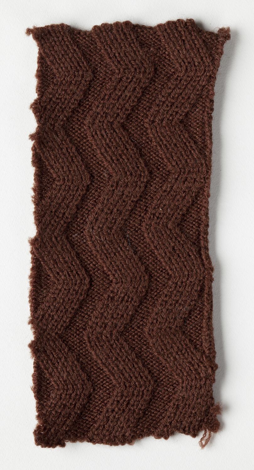 Brown knitting sample with zig zag pattern, one of many made by Edda Azzola to test designs prior to making a garment. Edda Azzola, nee Pugnetti, was born in 1927 in Moggio Udinese in the Friuli region, northern Italy and the family moved to nearby Pontebba four years later. In Italy Edda and her two sisters worked as knitting machinists from the family home. Edda married Angelo Azzola, a young man from her village and they migrated to Australia in the mid 1950s.