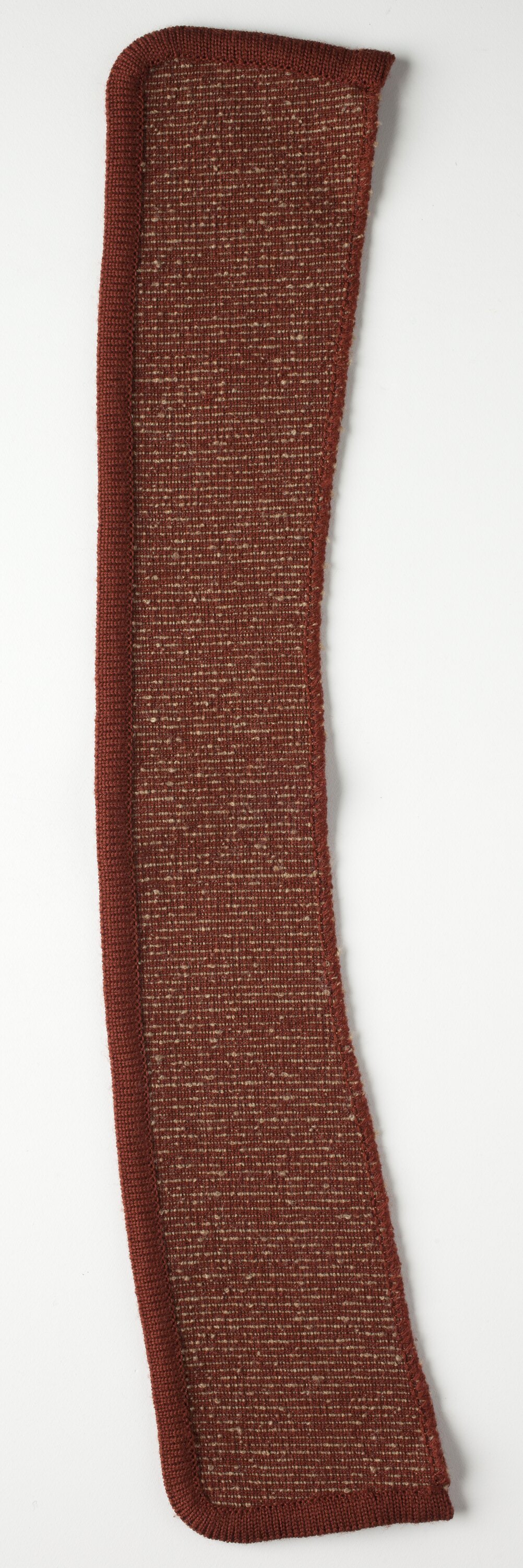 Long knitting sample, flecked brown coloured with brown trim. For lapels or edging. One of three related pieces.
