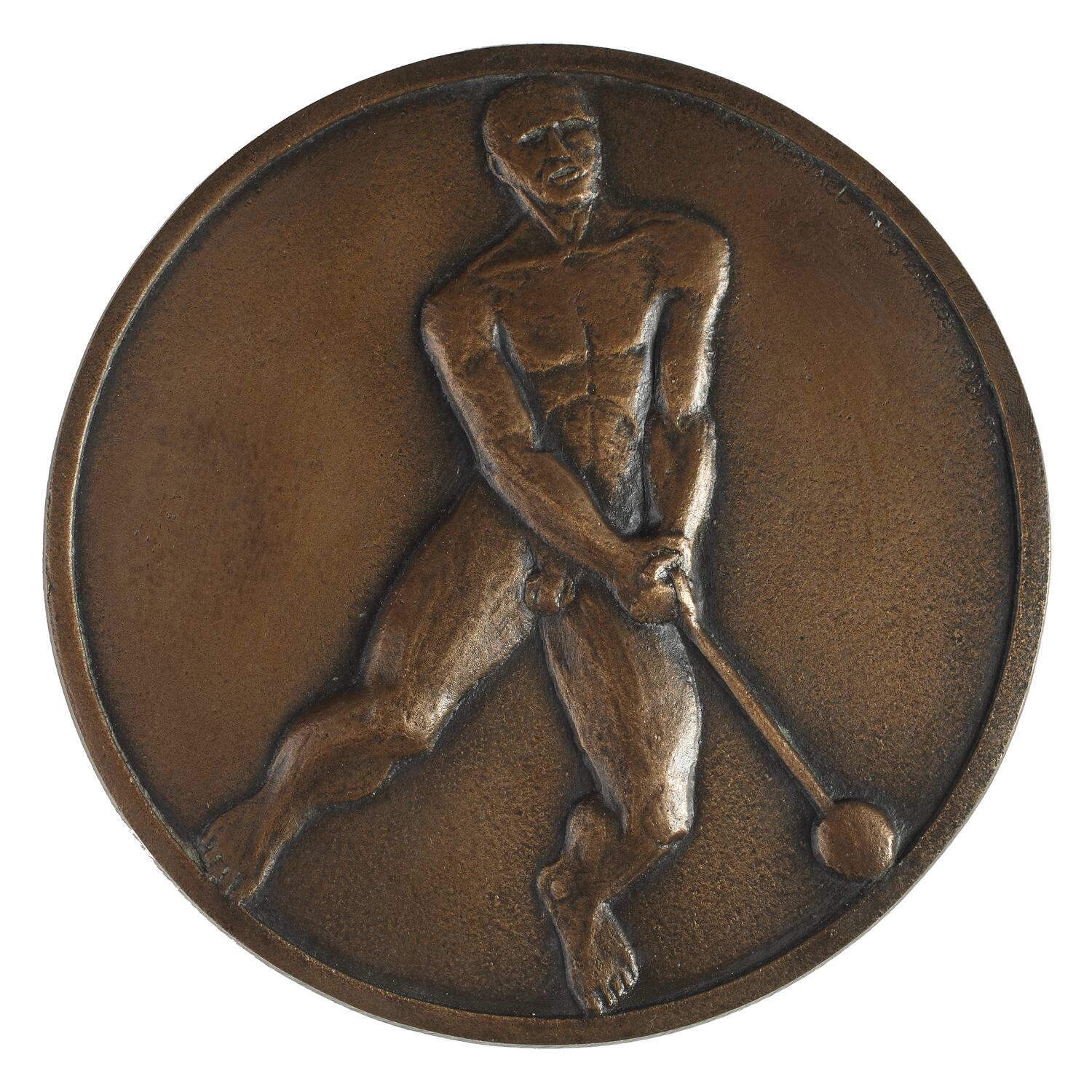Bronze medal depicting a naked man twirling a round object on a chain.