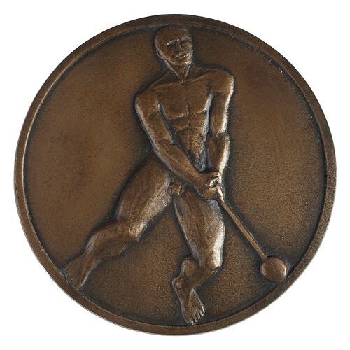 Bronze art medal titled 'Hammer Thrower' by Melbourne sculptor Michael Meszaros, 1996. The naked figure recalls the classical compositions of the work of Meszaros' father, Andor, but the treatment and modelling are entirely contemporary. The figure is braced against the rim, and the rim describes the arc of the hammer as it is swung around the athlete's head.