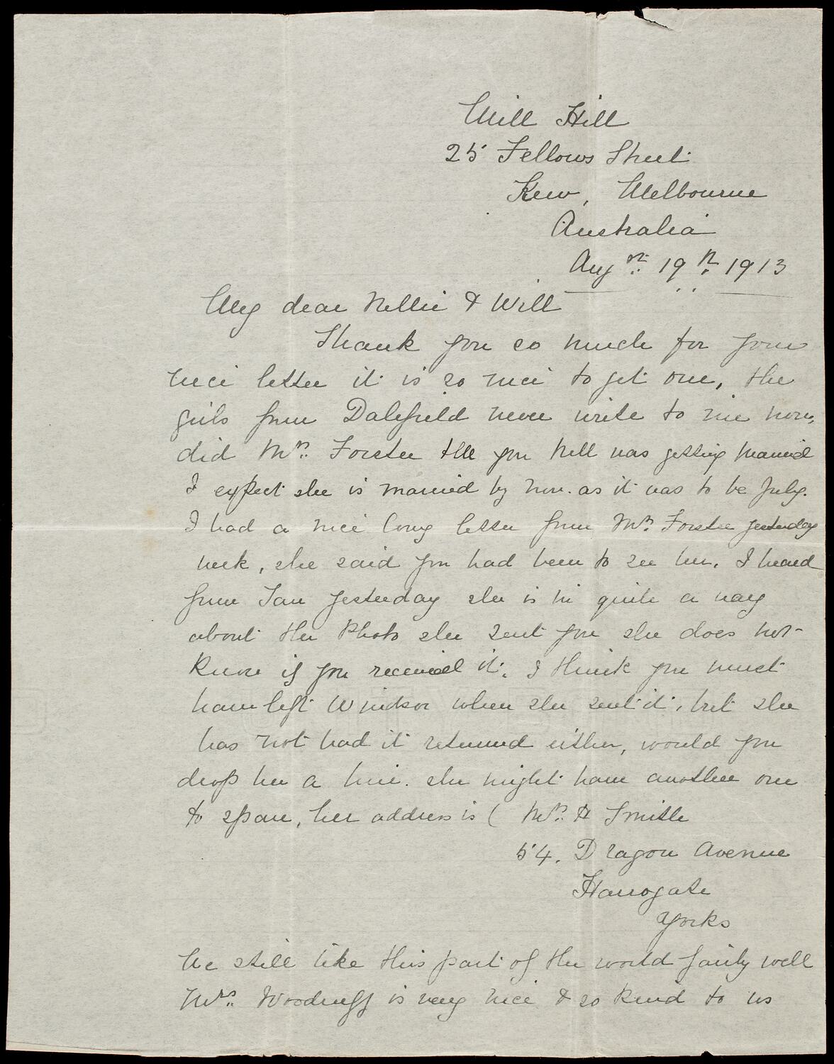 Header: Mill Hill/25 Fellows Street/Kew, Melbourne/Australia/August 19th 1913 My dear Nellie & Will Thank you so much for your nice letter it is so nice to get one, the girls from Dalefield never write to me here, did Mrs Forster tell you Nell was getting married. I suspect she is married by now as it was to be July. I had a nice long letter from Mrs Forster yesterday week, she said you had been to see her. I heard from Jan[?] yesterday she is in quite a way about the photo she sent you she does not know if you received it. I think you must have left Windsor where/when[?] she sent it, but has not had it returned either, would you drop her a line she might have another one to spare, her address is (Mrs H Smithe 64 Dlagon[?] Avenue/Harrogate/Yorks We still like this part of the world fairly well. Mrs Woodruff is very nice & so kind to us so that is something you will see we are in our proper house now it is quite a country place very quiet, a 4' fare into Melbourne. I wish it was a cheaper place, everything is dear except meal; for a 1' reel of cotton you have to pay 2d everything seems double, so you see one [?] much like that. I wish I had bought a lot of my felt shoes out with me they all seem to be [?] bed room slippers here & so dear I miss the cheap shops very much there is no 1' Bazaar or house & [?] shops either, we have a nice woman to do needlework here, she has been three times she came on our boat, her husband can't get any work, there seems to be no work for men only on the land & up in the bush there are quite a lot of men without work. Mrs Woodruff has gone away for a week so I are[?] housekeeper, we have plenty to eat & I [?] things the same as at Dalefield. I had a very nice letter from Mrs Cooper yesterday she is very glad we are here. Mrs Woodruff's niece/ is staying here, the one that came out with her, but she is going back to England in [?] months time. I think she is going to Frickley[?] first, if all's well we hope to go home in five years time, it seems a long time to look forward to. That is if we are still with Mrs W, we only have 4 more [?] to pay here. Then we shall be able to keep all our wages. I am glad to say Kit looks much better for being here & she eats so well & the same with me I look ever so much better & eat like anything. Perhaps we are all going to Tasmania for Jan & Feb. Those are the two hot months here. It costs 4£ & 8d return for each person. Don't you think that is a lot of money. Your[?] dear Kit & I both send our very best love to yourself & Will. Wishing[?] you are both well, write again as soon as you can. It takes just over four weeks bye by dear your ever Loving friend Lettie