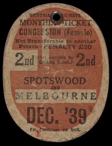 Small oval-shaped stiff card ticket for female second class concession monthly transport for Spotswood and Melbourne, for December 1939.