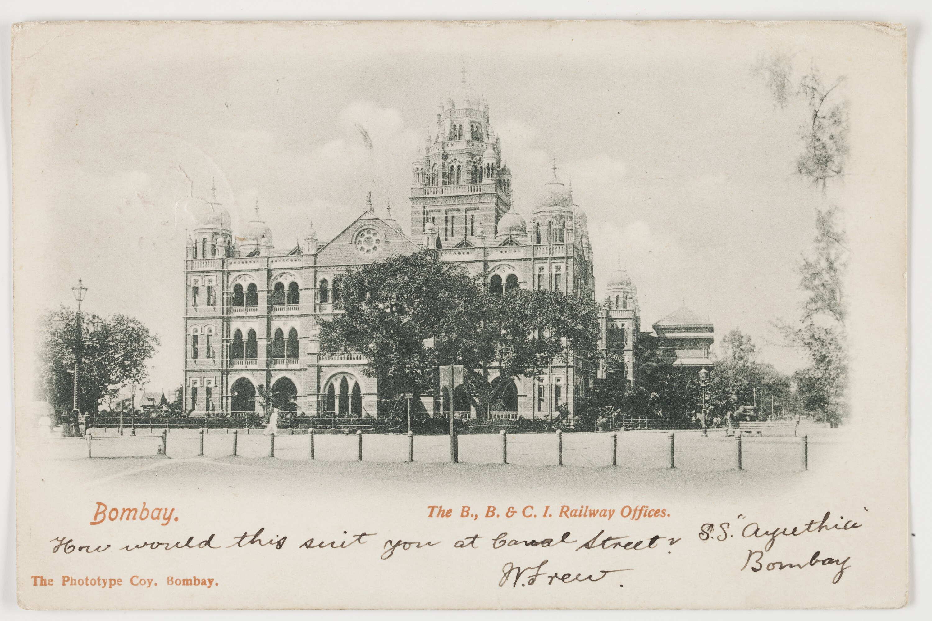 Printed: Bombay. The B., B. & C. 1. Railway Offices. The Phototype Coy. Bombay. Handwritten text: 'How would this suit you at Canal Street? W. Frew S.S. "Cynthia" Bombay Mr Jas B. Scott 12 Hillview Paisley Scotland