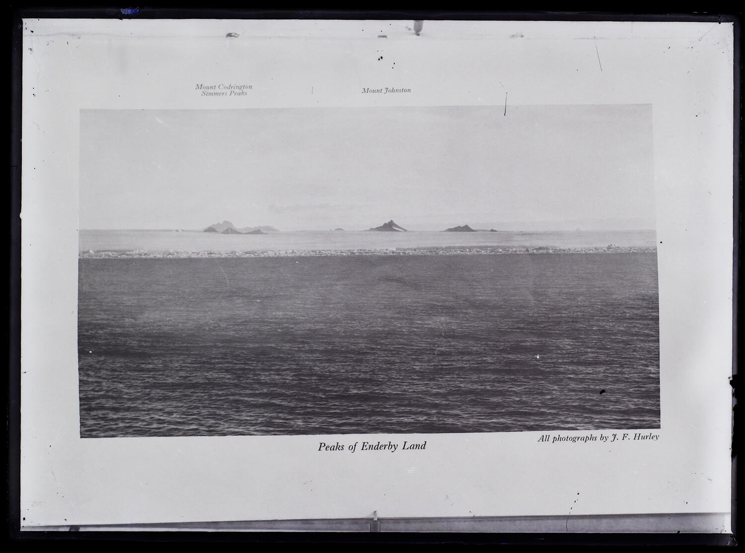 Peaks of Enderby Land'. Nunataks as seen from the ship Discovery in January 1930. They were Mount Codrington, Simmers Peaks and Mount Johnston. A copy of a printed page. Photograph taken during the British Australian New Zealand Antarctic Research Expedition (BANZARE), Voyage 1.