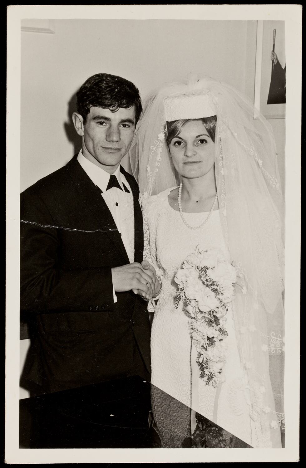 Couple holding hands, visible from thigh upwards. They are holding hands and standing indoors behind a table. The woman wears a white wedding gown, long veil and holds a floral bouquet; the man wears a dark suit and bow tie.