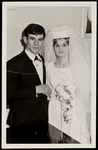 Black and white photograph of Eric and Faye Mangos on their wedding day, 2 June 1968. Fani Nitsou was born in 1945 in a village near Florina, Greece. In 1964 at the age of 18 she received an opportunity to migrate to Australia to live with distant cousins in Noble Park. She arrived in Melbourne aboard the RHMS Patris in March 1964; during the voyage she met fellow Greek migrant Iraklis Mangos. In 1967 she met Iraklis again they fell in love and in 1968 they married at the Holy Trinity Greek Orthodox Church in Richmond. They visited Greece in 1977 and have never regretted their move to Australia.