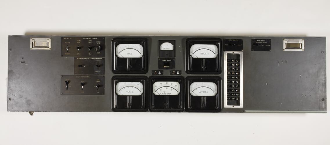 The components of the Alternating Current Network Analyser and related items, donated by Monash University, are: sign, control panel, load adjuster unit, capacitor unit, left and right busbar patch panels, system connection patch panel, cover panel, resistor unit, reactance unit, transformer impedance unit, generator unit, generator meter unit, switches, cables, photographs of electrical gauge panels and desk, two instruction manuals, two reports, two instruction books, one blueprint, and Monash University display labels. For more detailed descriptions, please see the Narrative entitled: 'Components and items associated with The Network Analyser - descriptions and inscriptions'.