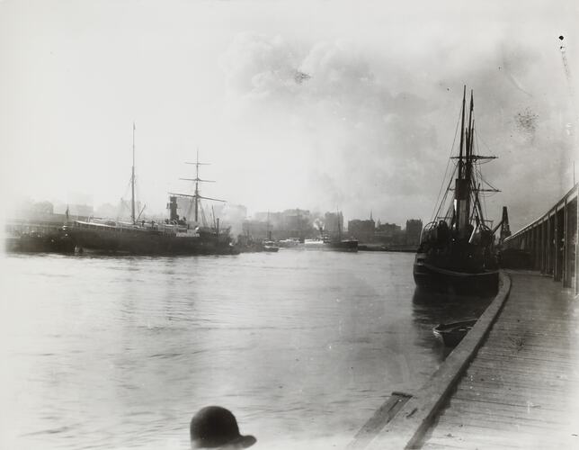 Black and white image depicting sailing ships and steam ships at Victoria Dock, circa 1905. It is one of a collection of forty black and white photographs reproduced from glass negatives, lantern slides and photographs. Images show early architecture and buildings in Melbourne and Sydney and Victorian bushland scenes, dating from 1856-1920s.