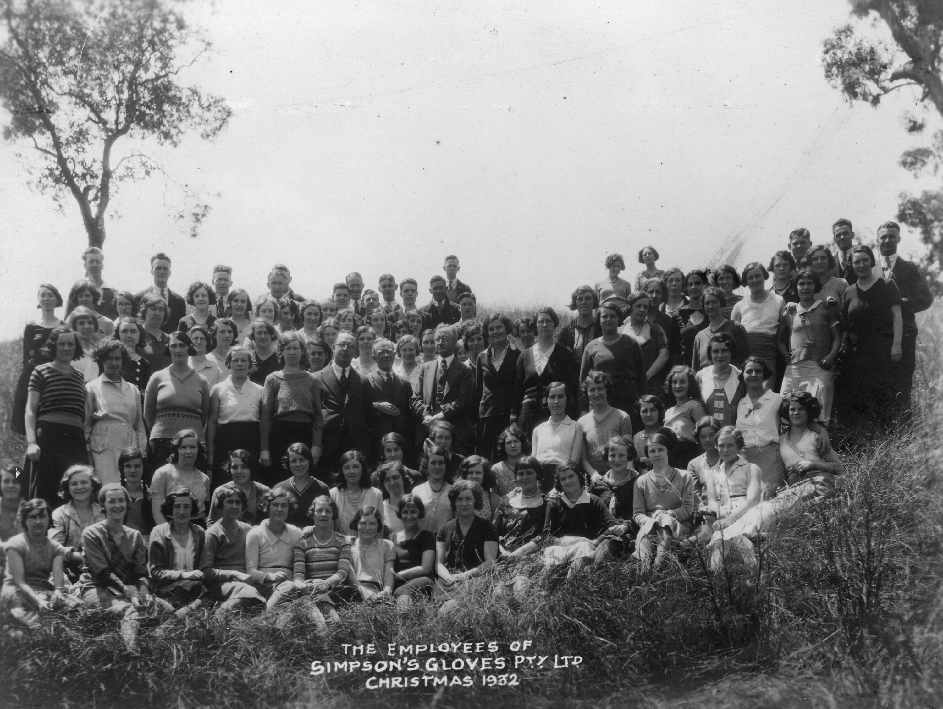 Group photograph of the managers and employees of Simpson's Gloves Pty Ltd, Christmas 1932. The photo was probably taken at nearby Studley Park.