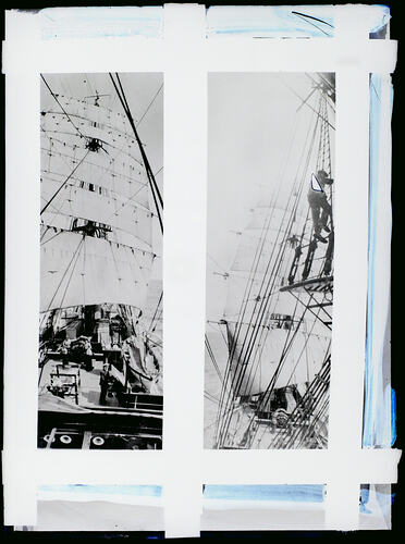 Split negative. Left shows the 'SY Discovery' with a man on the deck wearing a sailor's hat. On the right shows the 'SY Discovery' with a man climbing up the rigging of the ship's mast. Eric Douglas said 'Left - The Bridge looking aft and Right - A view from the foreyard looking aft'. Photograph taken during the British Australian New Zealand Antarctic Research Expedition (BANZARE), Voyage 1.