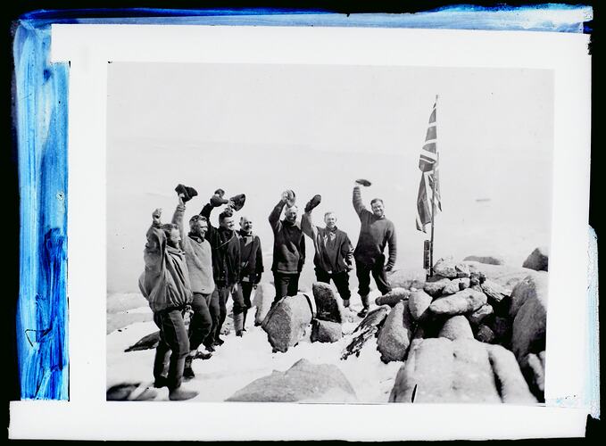 Black and white glass negative of explorers raising the flag at Proclamation Island, Antarctica.