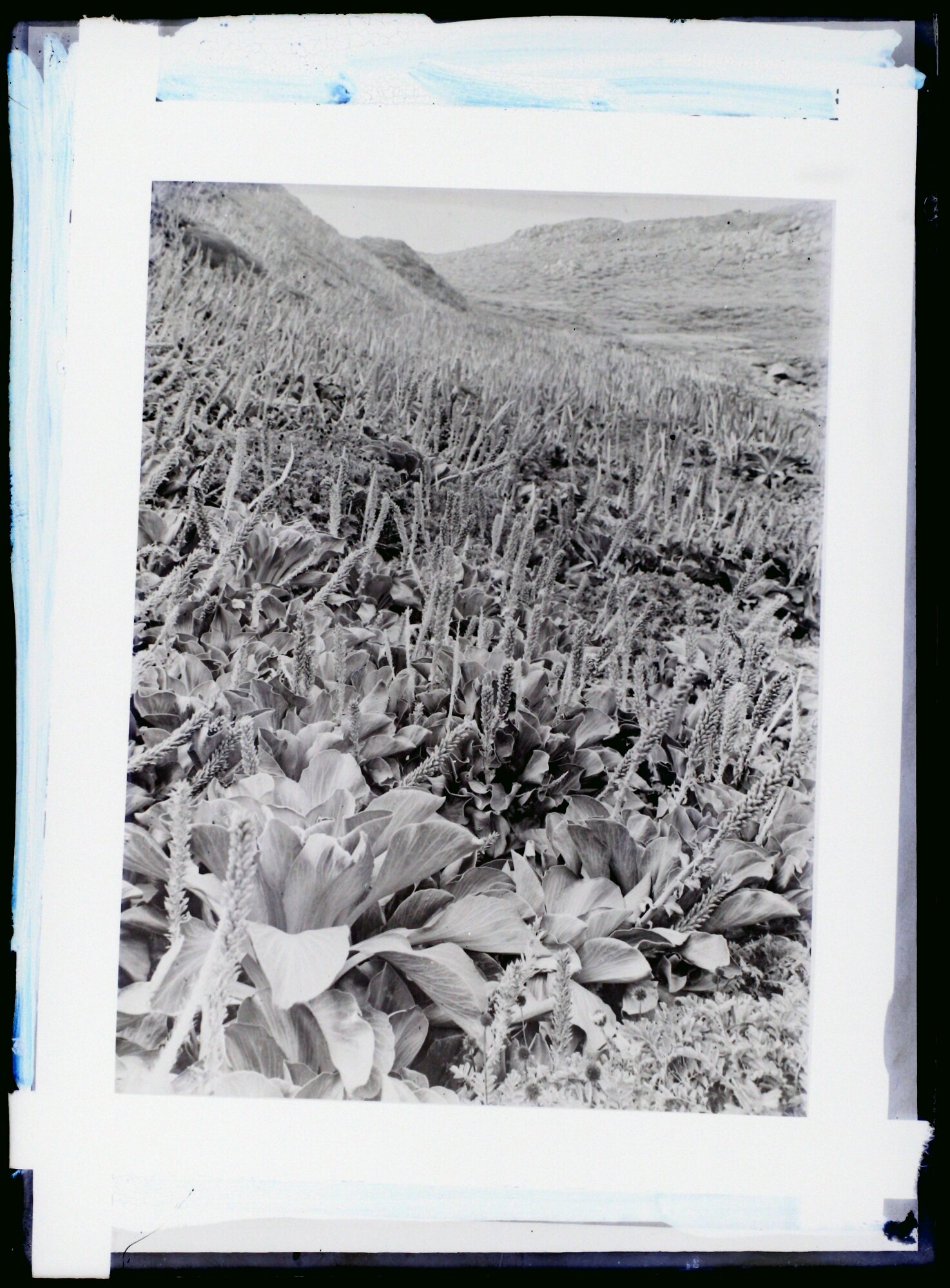 Black and white glass negative of Kerguelen Cabbage, Kerguelen Island, Antarctica.