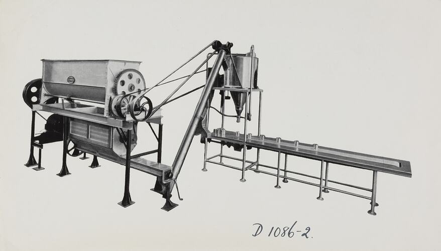 Black and white promotional image of a mixing, sifting, conveying and packing self contained plant. It is part of a collection of photographs and marked printer's copy used in the preparation of trade literature promoting products manufactured by the Schumacher Mill Furnishing Works Pty Ltd. The items were originally housed in a wooden filing drawer, with many filed by subject. This print was previously filed under 'Automatic (Milk Powder)'.