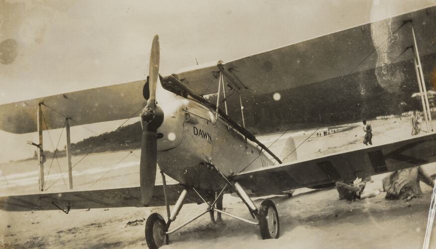 Coastal scene showing VH-UKJ a de Havilland DH.60G Moth biplane named 'Dawn' parked on a beach, possibly at Lorne, Victoria