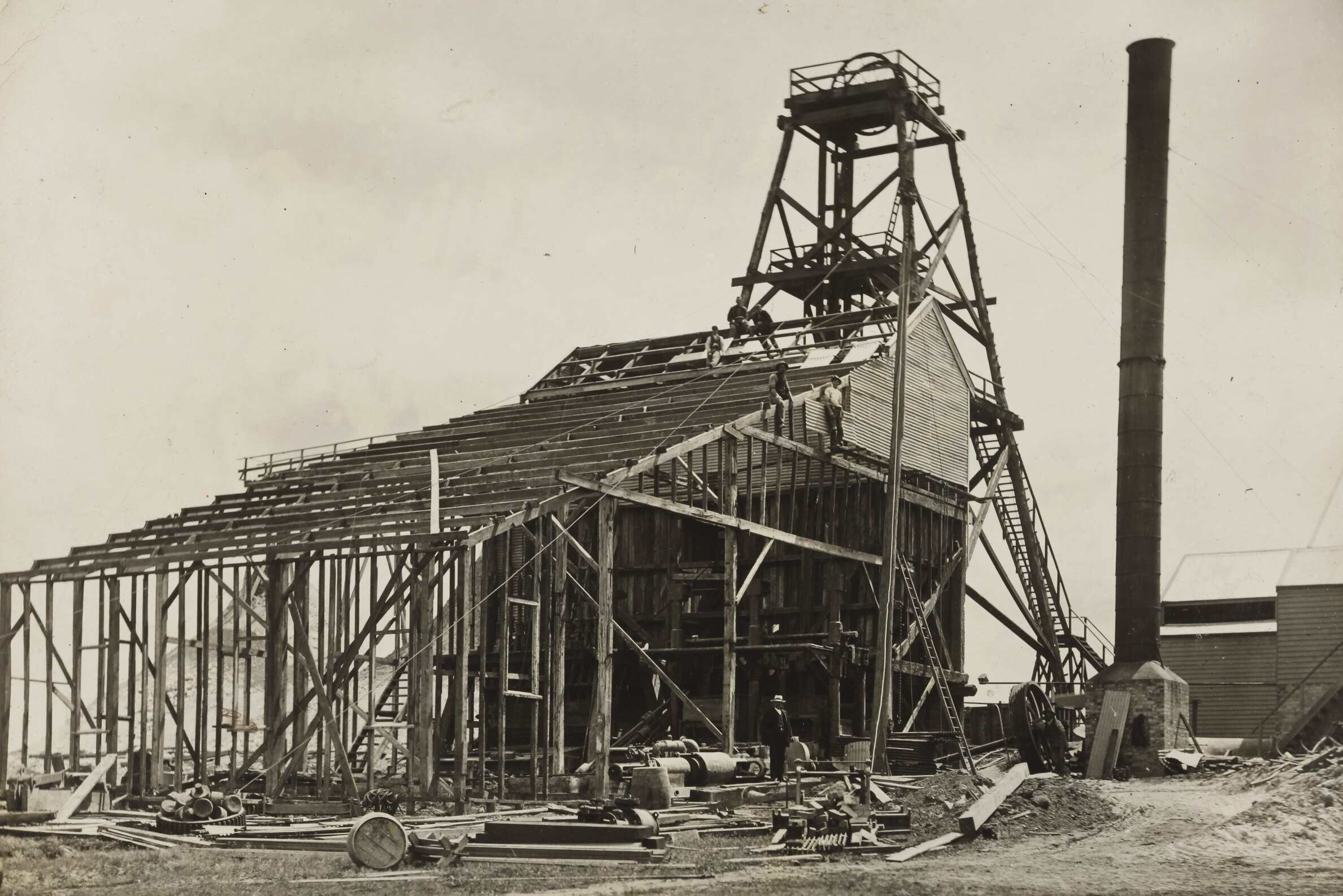 The poppet head and buildings under construction at the Berringa Mine.