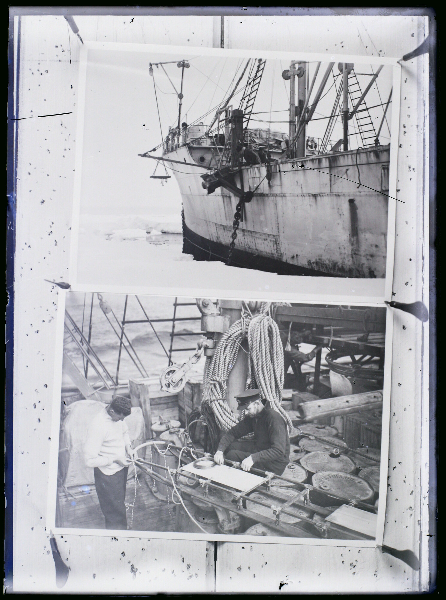 Negative made from a copy of two photographs. The top photograph is of 'Discovery II' in the pack ice. Eric Douglas said 'A view from the pack ice of the Discovery II cutting through the ice floes, January 1936'. The bottom photograph is of RAAF Personnel Flight Lieutenant Douglas right and Sergeant Cottee left, binding a sledge. This sledge was loaned by Sir Douglas Mawson. Photographs taken during the Ellsworth Relief Expedition, 1935-1936.