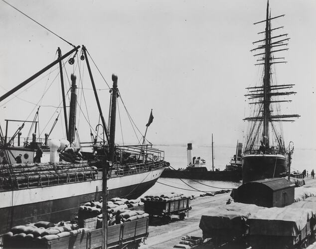 Exports, Grains, Sailing Vessels, Shipping Docks, Shipping Industry, Ships, Tramways, Water Transport, Wheat