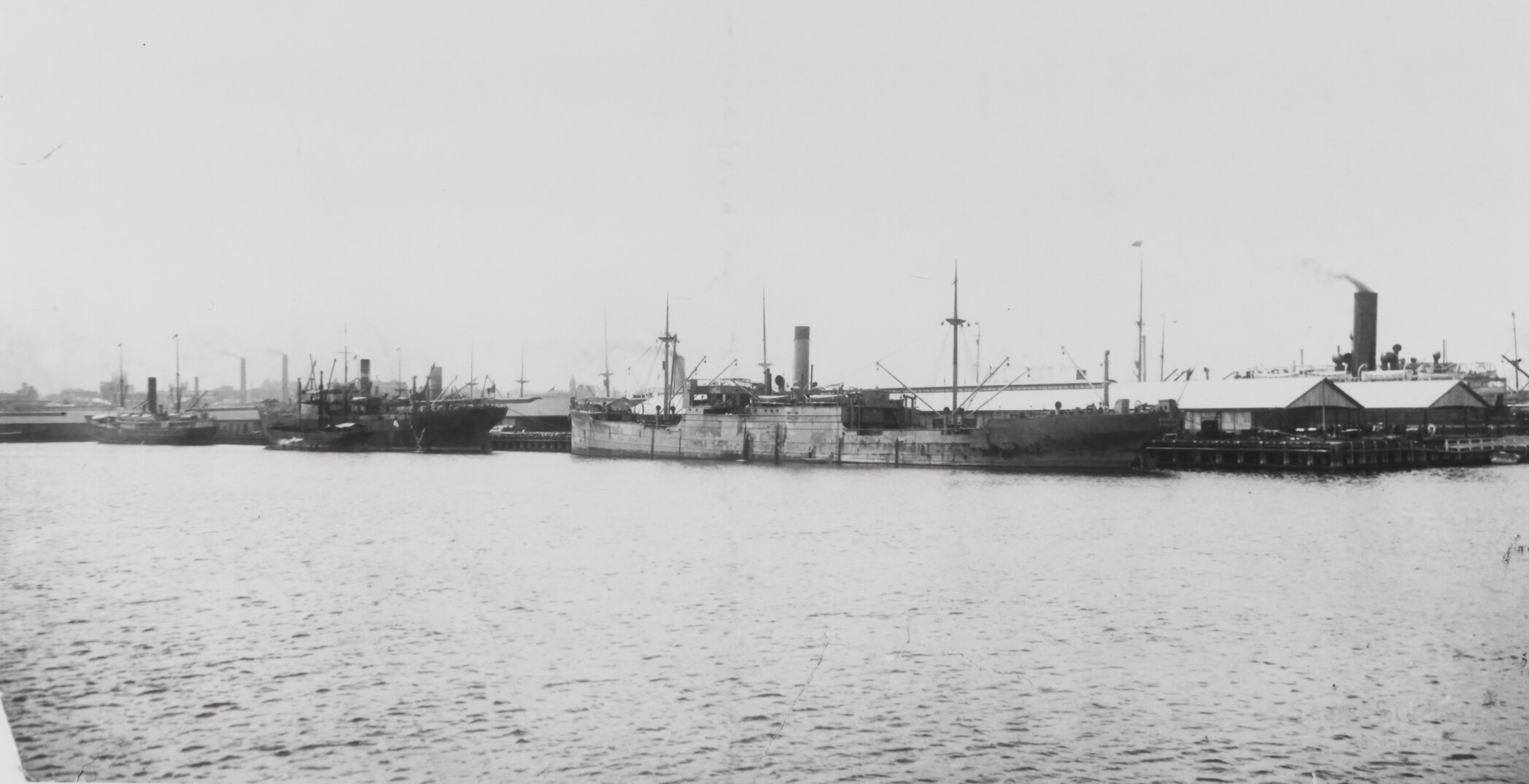 Black and white photograph of cargo ships in the water at Victoria Dock, 1920-1939. It is one of a collection of fifteen black and white photographs showing passenger and cargo ships in Australian waters in the 1920s and 1930s.