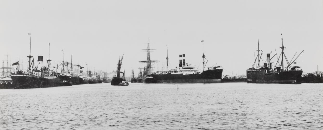 Black and white photograph of cargo ships in the water at Victoria Dock, 1920-1939. It is one of a collection of fifteen black and white photographs showing passenger and cargo ships in Australian waters in the 1920s and 1930s.