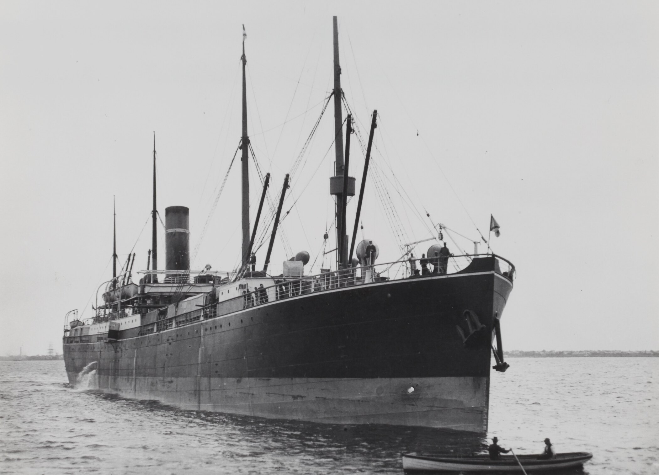 Cargo screw steam ship SS Itonus on water. Two men in a row boat are shown in the foreground.