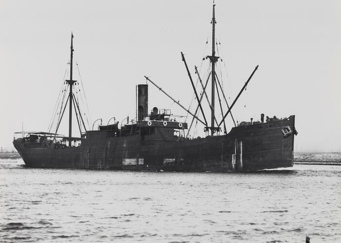 Black and white image of a cargo steam ship. It is one of a collection of fifteen black and white photographs showing passenger and cargo ships in Australian waters in the 1920s and 1930s.