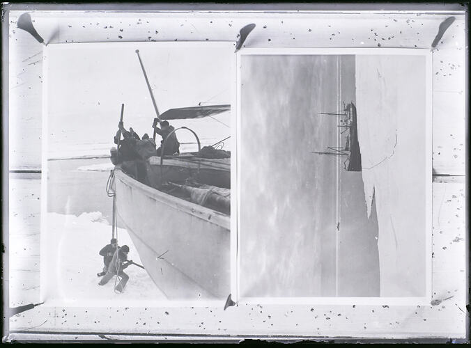 Negative made from a copy of two photographs. The top photograph shows two of the crew from the Discovery II are 'poling off' standing on ice near the bow of the ship. Other crew members are assisting from the ship's deck above. The bottom photograph is of Lincoln Ellsworth's expedition ship the Wyatt Earp in sea ice. In the background is the Discovery II. Photographs taken during the Ellsworth Relief Expedition, 1935-1936.
