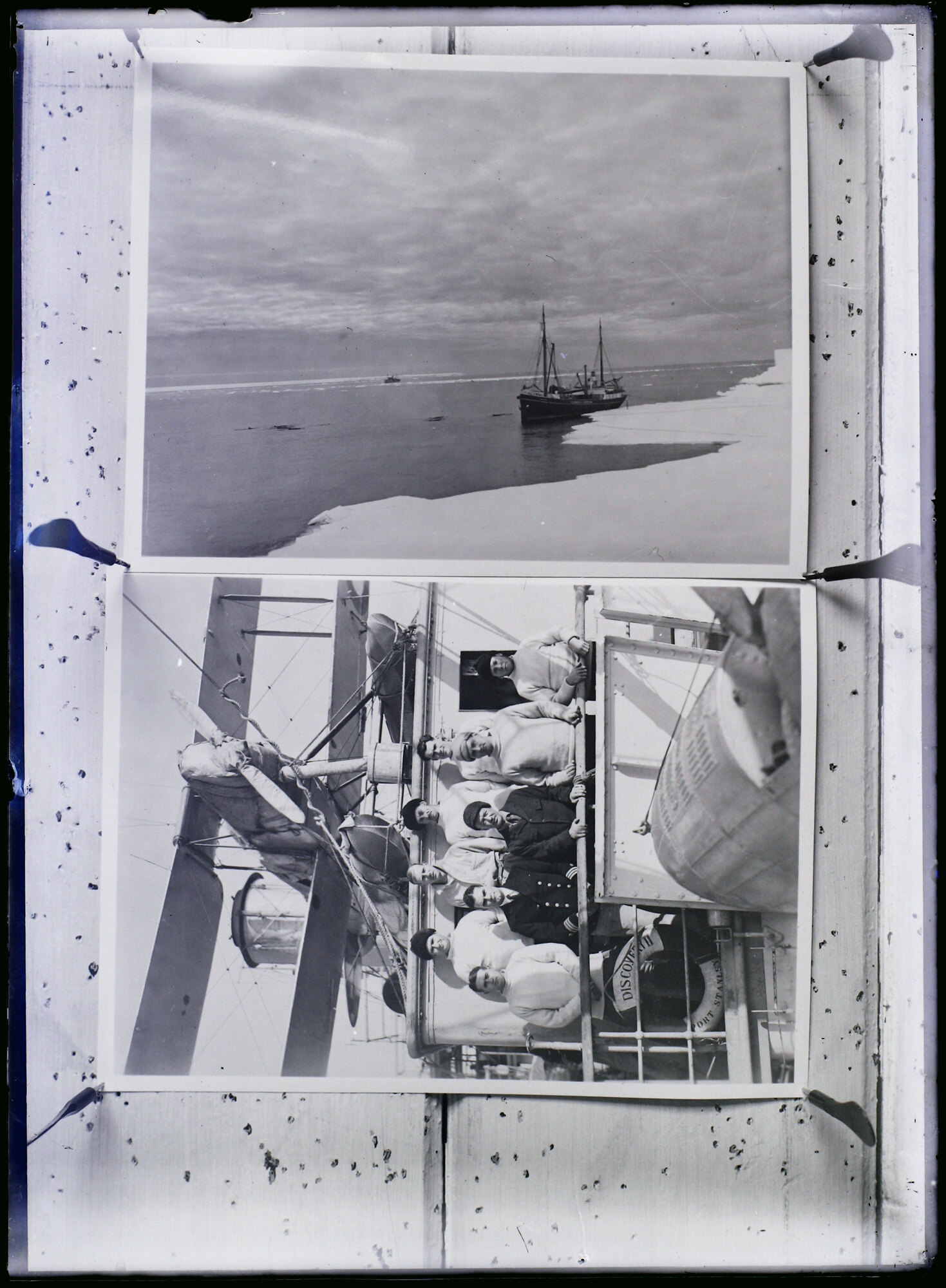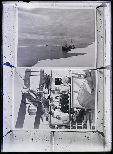Negative made from a copy of two photographs. The top photograph is of Lincoln Ellsworth's ship 'Wyatt Earp'. Whales are blowing near the Wyatt Earp which is at the icy shoreline. The Discovery II can be seen in the distance. The photograph below is a group photo of the RAAF Party on board the ship Discovery II on the return journey to Melbourne. Lincoln Ellsworth is in the middle of the front row. Lieutenant Leonard C Hill, the Captain of the Discovery II is on Ellsworth's right and Flight Lieutenant Eric Douglas leader of the RAAF contingent is on Ellsworth's left side. The other six men are members of the RAAF party of seven. Photographs taken during the Ellsworth Relief Expedition, 1935-1936.