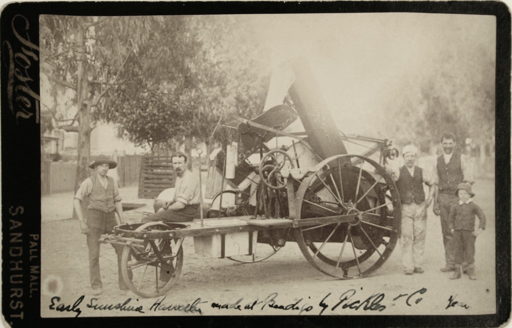 Printed on mounting card down lefthand edge: 'Foster / PALL MALL, / SANDHURST' Written at the bottom of image: 'Early Sunshine Harvester Made at Bendigo by Pickles & Co, about 1890'