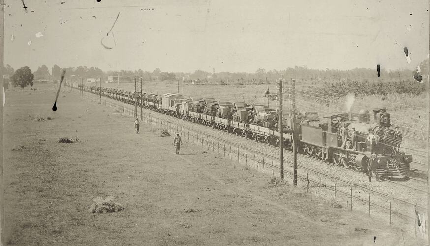 Train travelling through a field loaded with numerous Sunshine harvesters. Several men stand at the front on the engine and pose for the photograph. Two men walk beside the train in the nearby field.