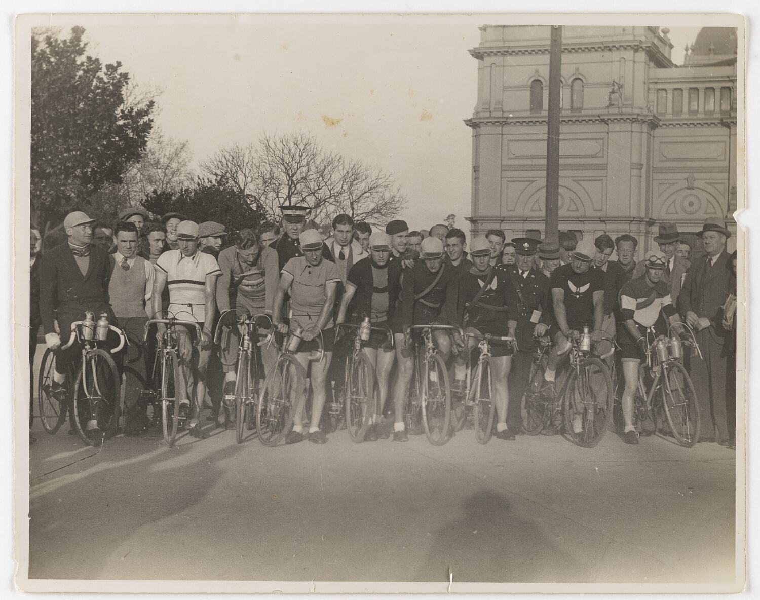 Group of male bicycle riders, they are in a line possibly starting a race. A large group of men is standing behind the riders. The (Royal) Exhibition Building in background.