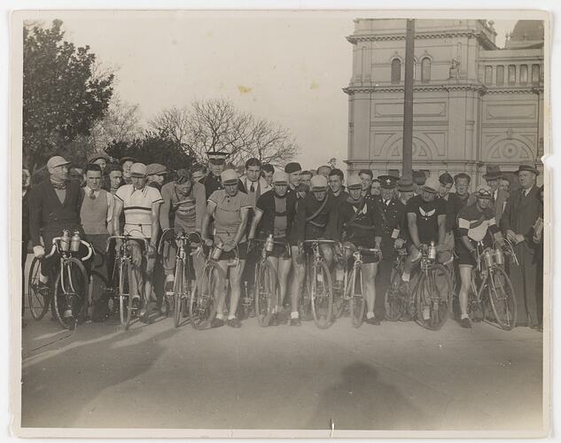 Group of cyclists lined up outside the Exhibition Building, they may be preparing for the start of the 1927 Dunlop Cycling Grand Prix road race.