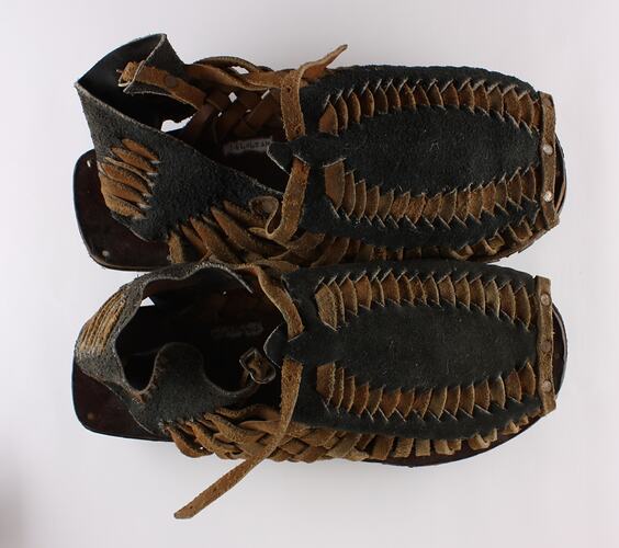 Shoes with suede leather uppers and soles made of recycled car tyres. Interwoven black and brown strips of leather, cross-woven on both sides. Larger pieces of black leather on top and around the back of the heel, interspersed with brown leather. Brown leather on both sides. Leather attached to sole with rivets (or similar). Leather strap over ankle with metallic buckle on inner side.