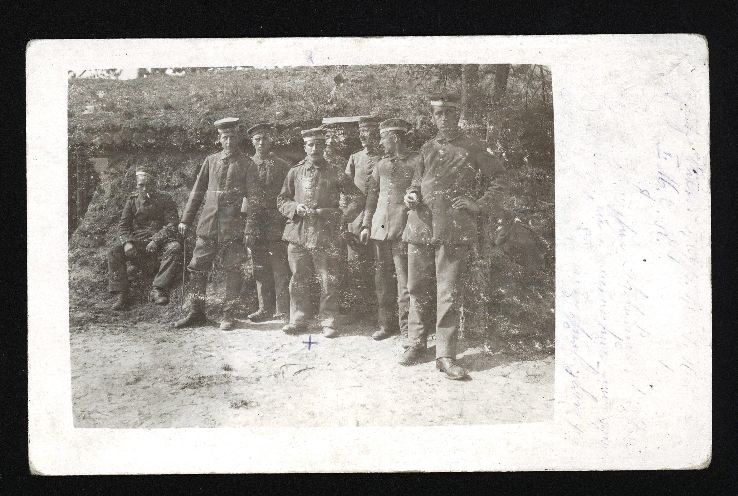 Goup of eight German soldiers standing at entrance to dugout beneath grassy slope - its roof reinforced with logs. Some of the soldiers are smoking and there is a X or a cross inscribed under the moustachioed soldier in the middle of the photo. Very faint handwriting on the side of the photo.