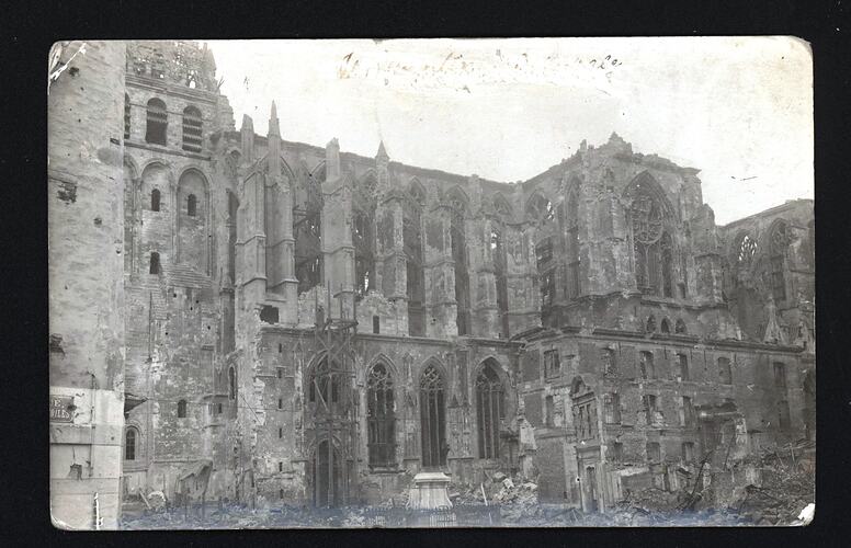 Postcard depicting a heavily damaged cathedral, probably in France or Belgium. A hand-written inscription on the front has been scratched out - probably was name of cathedral. It is likely to have been removed by censors.