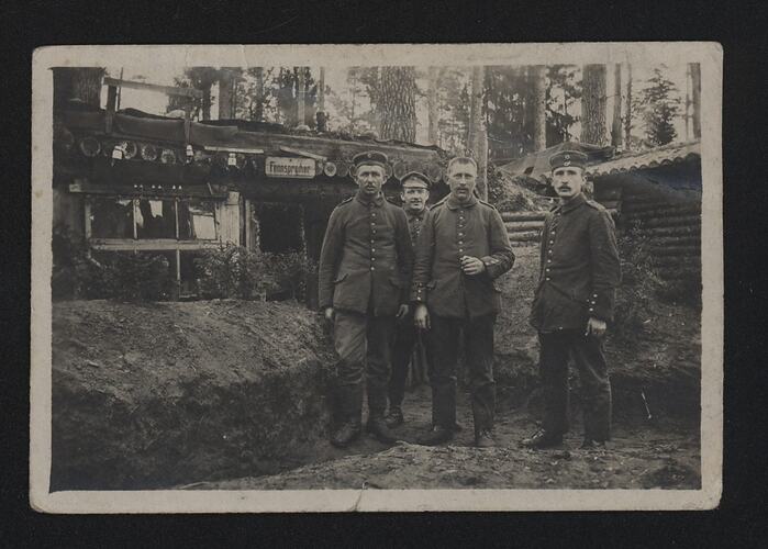 Group of four soldiers in front of a building labelled 'Fernsprecher'. Round discs are strung along either side of the sign, of unknown use. The hut has telegraph lines and insulators strung from its front, and a glass window. To the right of the building is another made of logs. The earth is dug into embankments around the buildings - the soldiers stand in an earthern ditch. Pine trees behind suggest a forest setting.