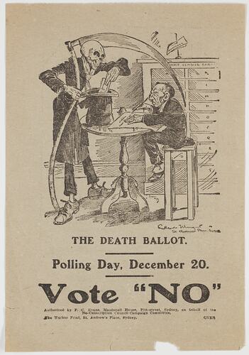 One side of the broad sheet features an image of Death looming over a young man as his mother ponders her ballot paper. On the other side is an image of a diminutive, almost snarling Billy Hughes, prime minister of Australia, and a scythe-bearing Death.