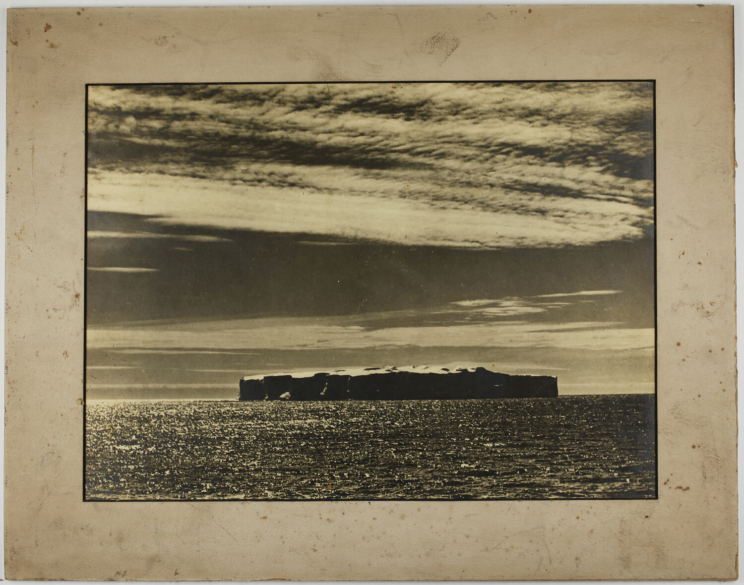 Monochrome photograph of a tabular iceberg, Antarctica, taken by Frank Hurley aboard the Discovery 2 durin the BANZARE expedition 1930-31.
